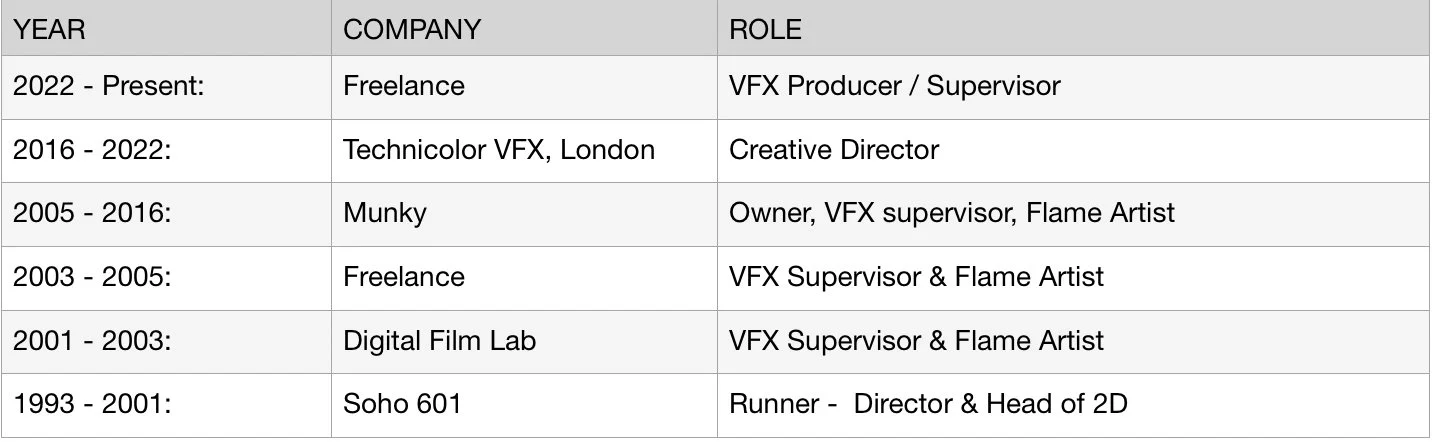 I’ve worked in the post and visual effects industry in London spanning three decades. I did 8 years at Soho 601 starting as a runner in ‘93, moving through library and tape op duties to junior online editor. I cut my teeth on music promos (Prodigy’s ‘Firestarter’ was in my first week!) before becoming lead Henry artist and Board Director.